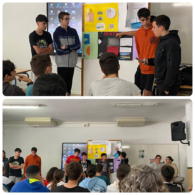 Inglés: Energías renovables en la Axarquía. Los alumnos de 1º A presentaron una serie de murales sobre las energías renovables y después pusieron en práctica lo aprendido a través de un Kahoot manual con piezas de cartulina para los invitados.